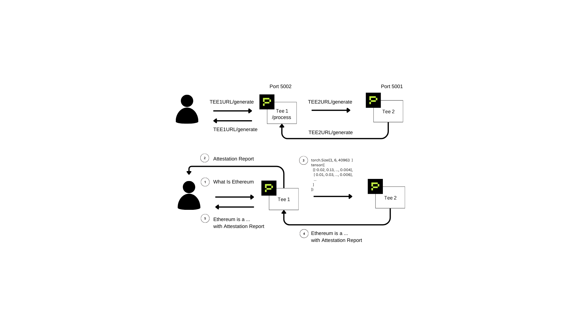 TEE2URL/generate, Port 5001). - TEE 2 Response Generation: Processes tensor input and returns the result back to TEE 1.