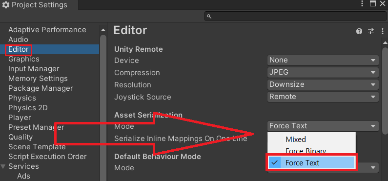 - Edit - Project Settings... - Editor - Asset Serialization - Mode를 Force Text로 변경