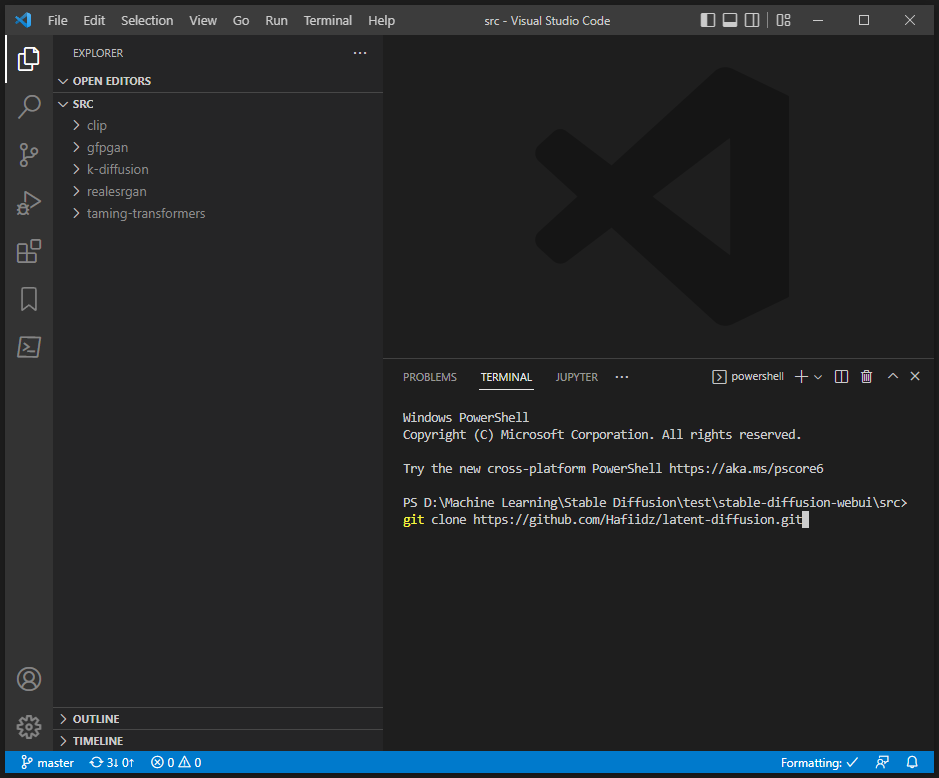 +2. You can do this by navigating to `/stable-diffusion-webui/src/` folder in your VSCode terminal, [git bash](https://user-images.githubusercontent.com/3688500/189250949-2d07dd66-1612-453f-ae23-5f7cd212f72d.png) or other relevant command prompt