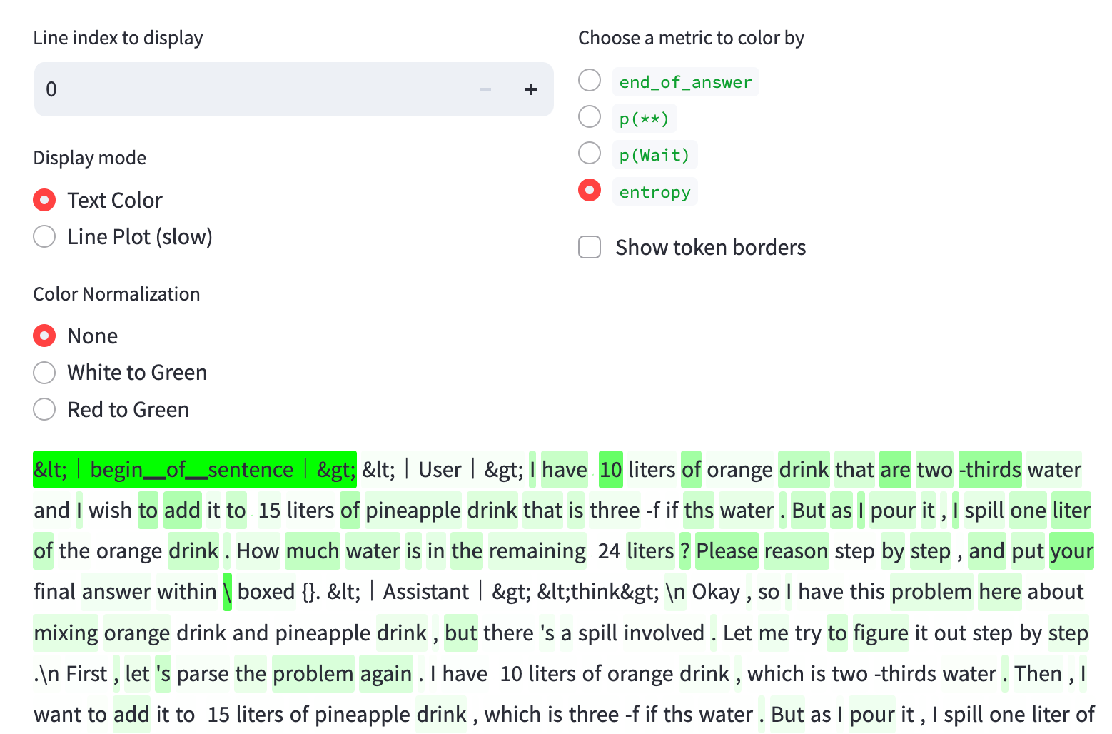 tokens: list of tokens (strings)metrics: dictionary of metric_name → list of float values with which to annotate the tokens (with the same length astokens)next_tokens(optional): list of dictionaries (same length astokens), which each map from a possible next token to its associated probability (or logits)annotations(optional): list of span annotations, each with:start: starting token indexend: ending token index (exclusive)label: annotation text