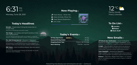 A daily information dashboard with current weather, daily agenda, to-do items, now-playing music, curated news, unread emails and even motivational quotes, all in one place.