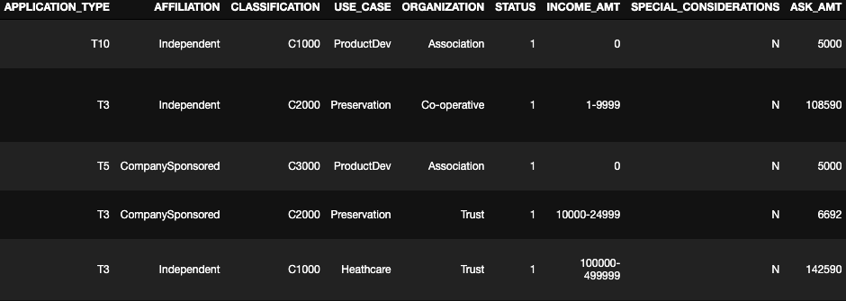 - What variable(s) are considered to be the features for your model? - APPLICATION_TYPE—Alphabet Soup application type, AFFILIATION—Affiliated sector of industry, CLASSIFICATION—Government organization classification, USE_CASE—Use case for funding, ORGANIZATION—Organization type, STATUS—Active status, INCOME_AMT—Income classification, SPECIAL_CONSIDERATIONS—Special consideration for application, ASK_AMT—Funding amount requested columns were used as feature variables.