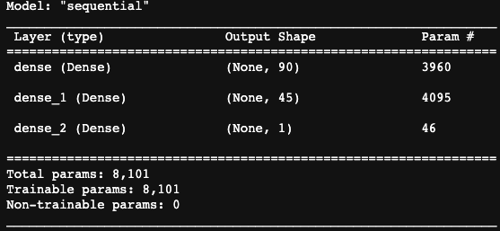 | Attempt 1 | Two | 90 and 45 | relu, relu, sigmoid | 82.63% | 68.04% |