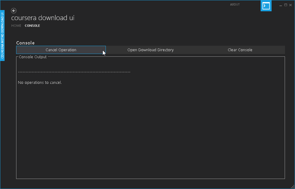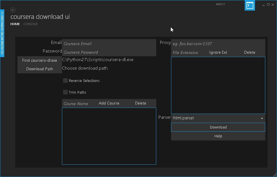 Use the coursera-dl.exe or coursera-dl-script.py scripts to download your coursera class information all at once. The Coursera Metro Download UI is a Modern/Metro frontend to the script.