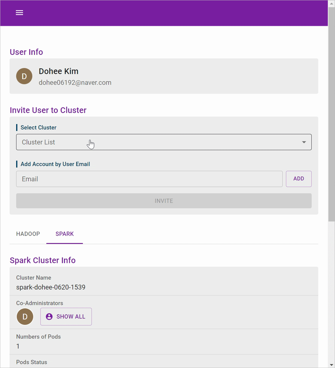 - 마이페이지에서 Hadoop/Spark 클러스터에 대해 타 사용자 초대 기능 제공