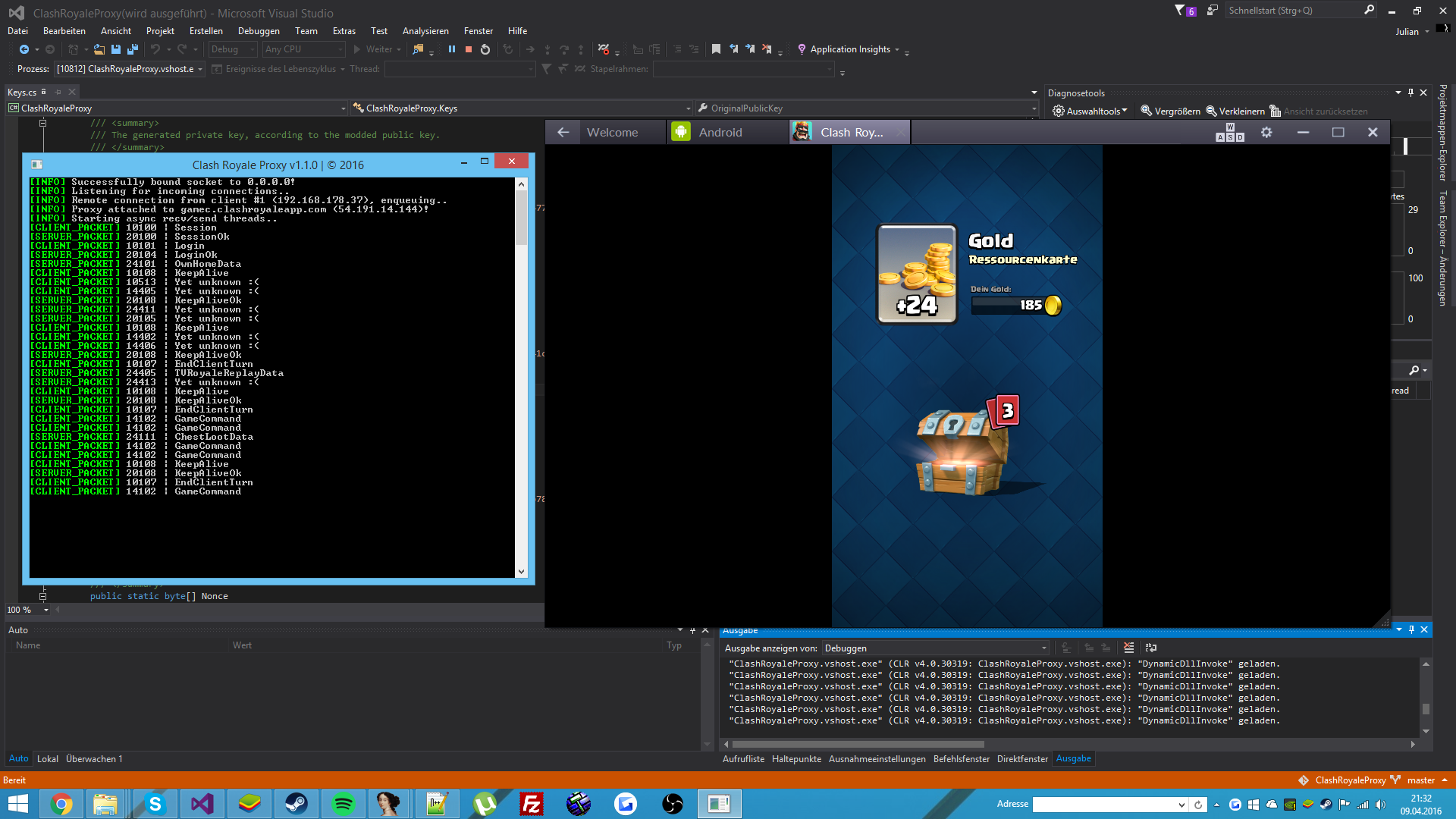 Open ClashRoyaleProxy.sln with your preferred C# IDE, compile it, make sure all NuGet packages are installed. Download this APK file and install it on your rooted android device. Connect to the official servers first, this step is required in order to get the latest patch files. Run & connect to the proxy.