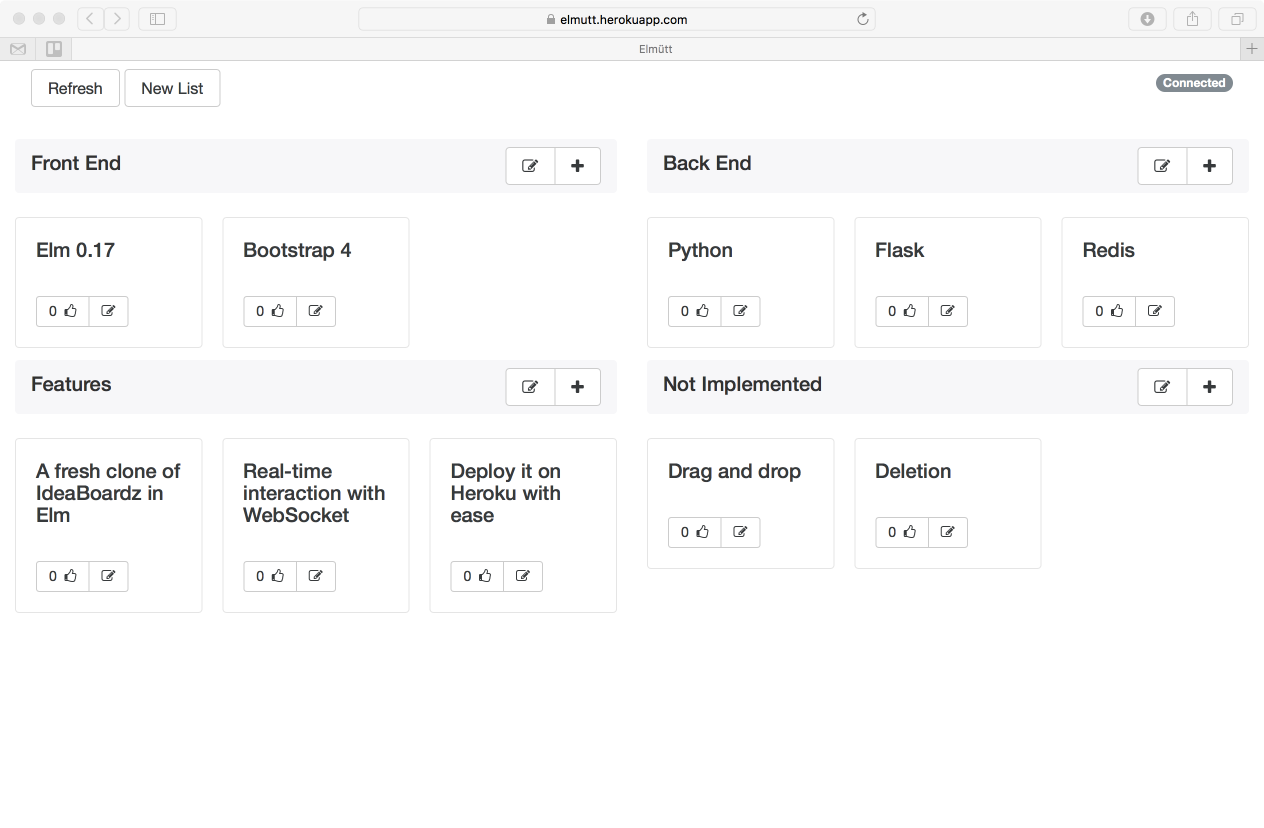 Elmütt (screenshot ) is a fresh clone of IdeaBoardz written in Elm.