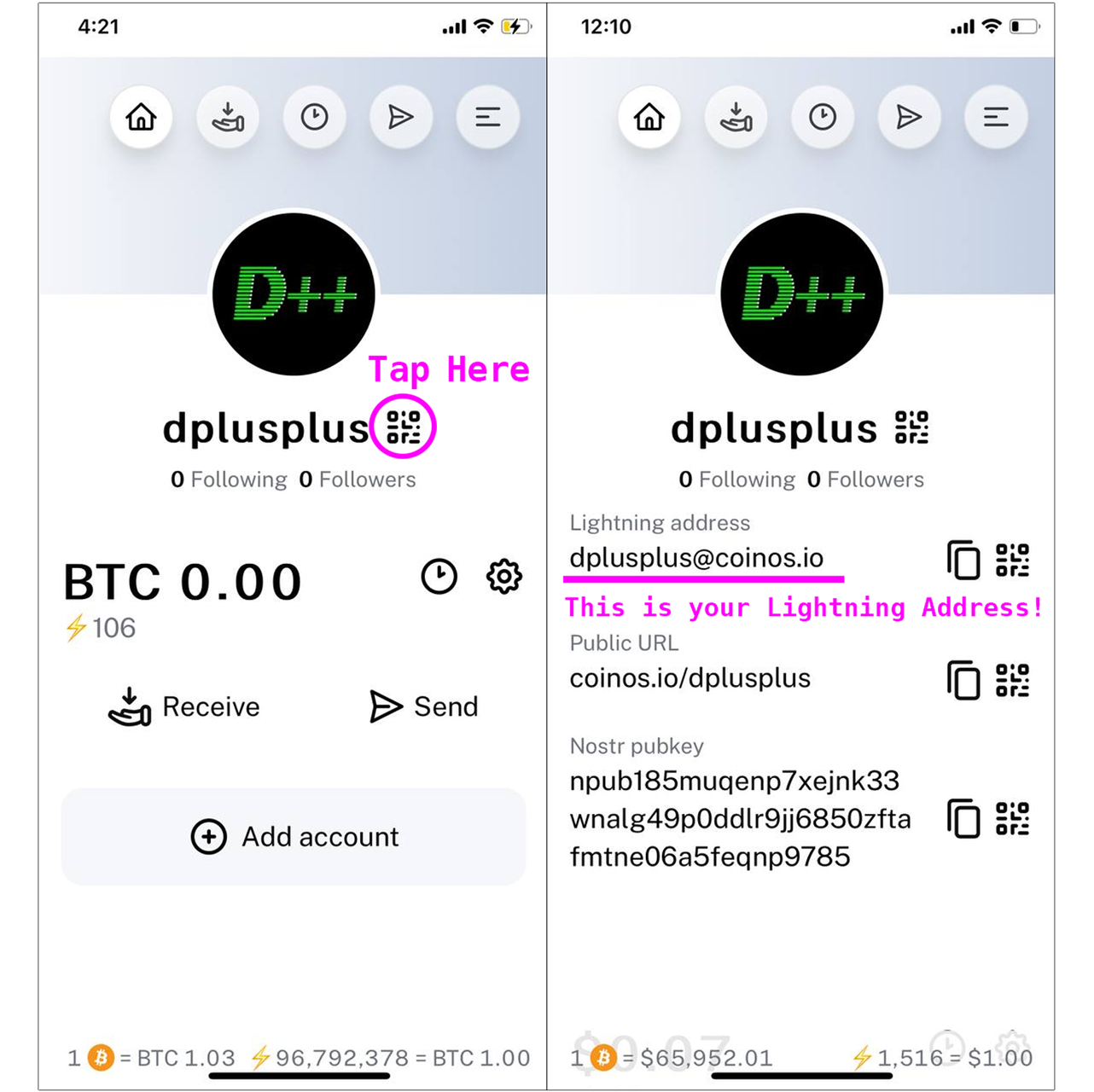Tap the QR code by your username. Your Lightning Address will then appear in the format username@coinos.io.