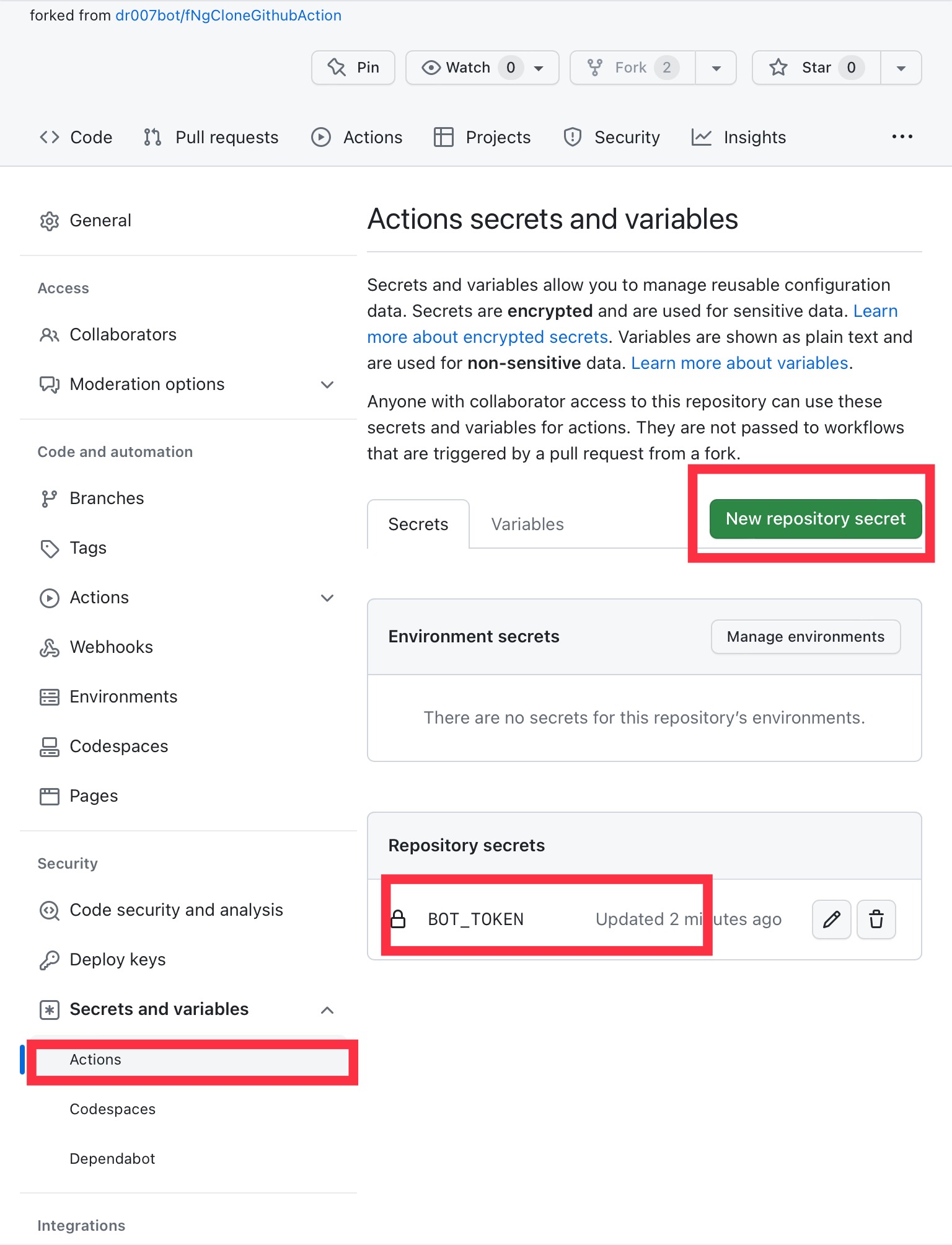 - Repo setting> secrests and variables > actions> New Repository Secret ကိုနှိပ်ပြီး Name နေရာတွင် BOT_TOKEN, secret value နေရာတွင် @BotFather မှ ရသော token ပထမဆုံးဖြည့်ပါ။