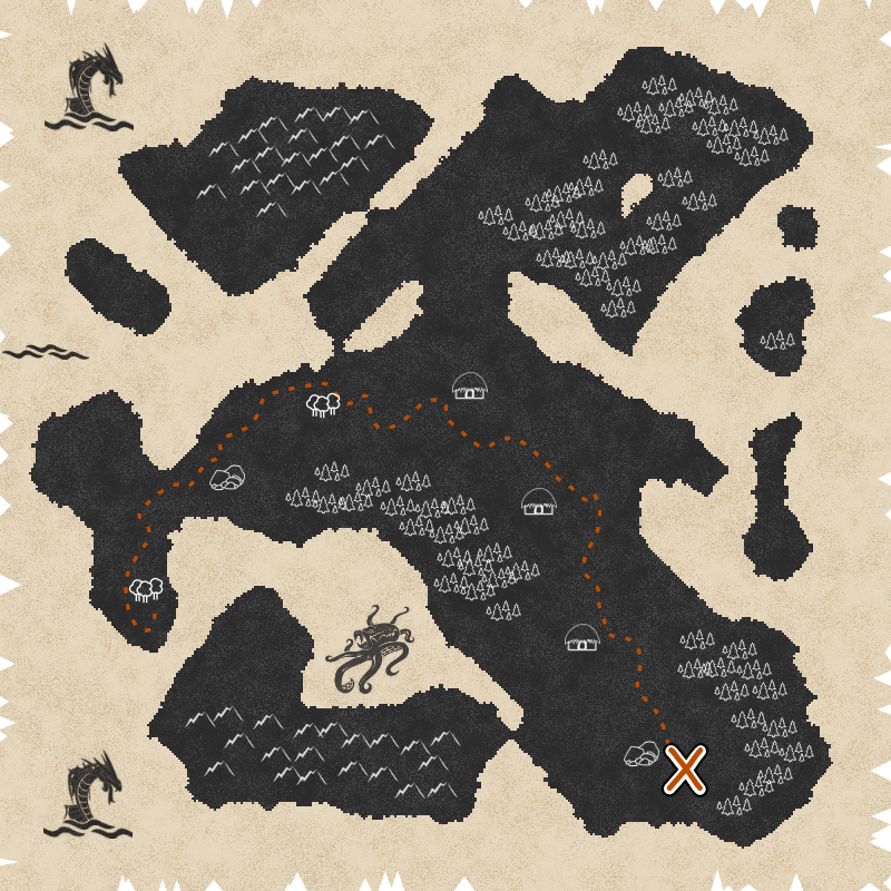 I already had the poisson disc sampling, cellular automata and diamond square lying around (though I needed to convert them to typescript) so most of my time was spent on the actual treasure map algorithm.