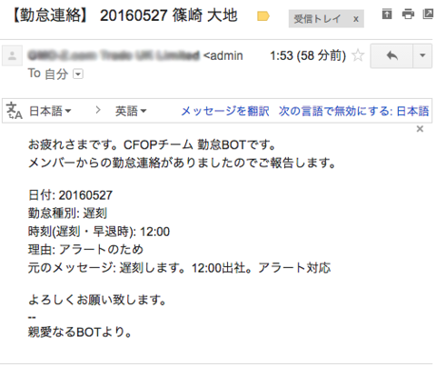 BOTに話しかけると、勤怠の概要を表示しつつ、メールを送りたいか聞いてきます。 送りたかったら yes, やめる場合は noと話しかけて下さい。
