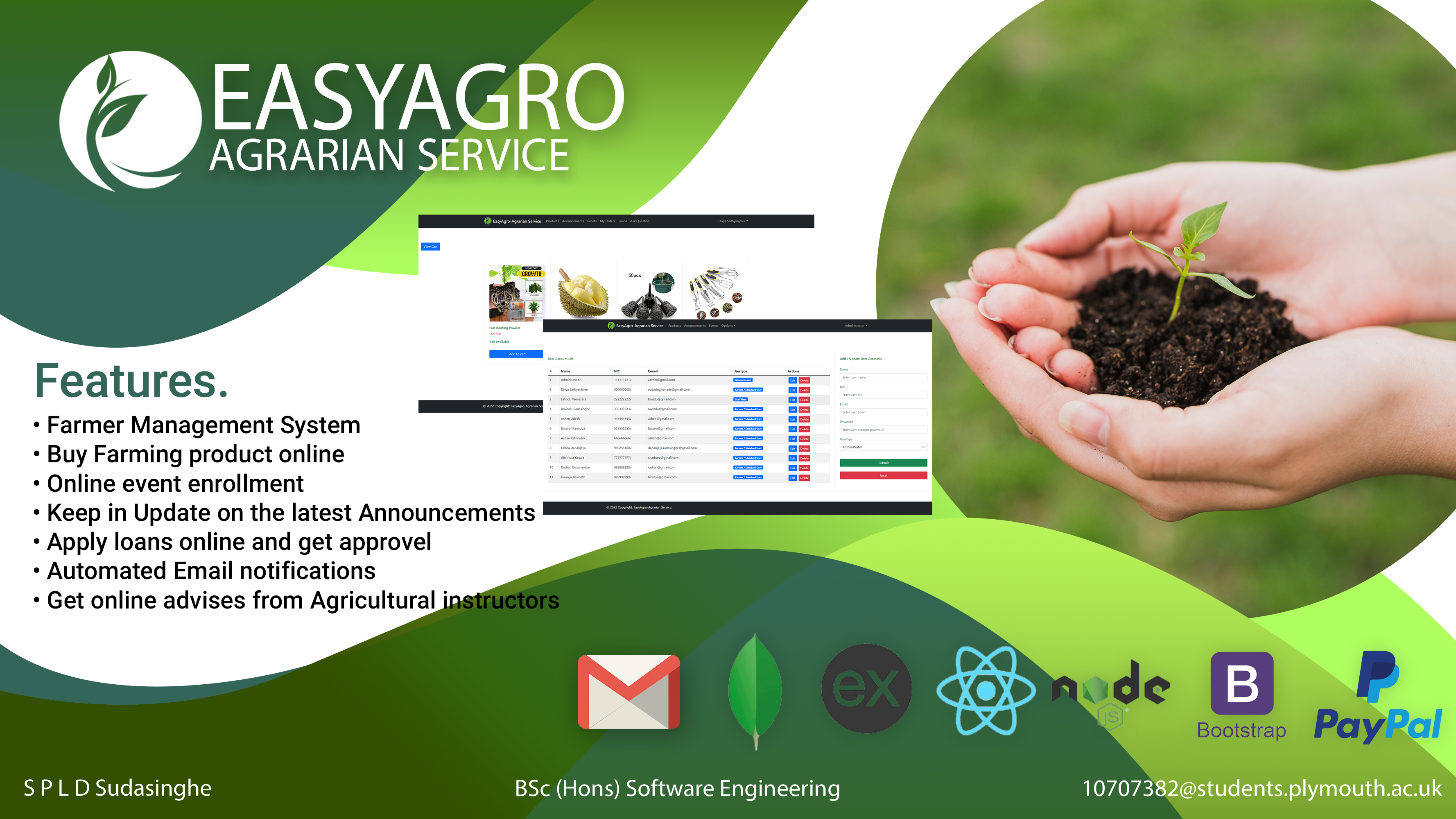 AgroEasy is a web solution that is made for Dewalapola Agrarian Service Center. Dewalapola Agrarian Services Center is an institution which provides services to many residents of the area. Farmers in 39 Grama Niladhari Divisions receive services from this institution which has a total staff of about 50. The institute provides a wide range of services such as providing agricultural advice, selling seed fertilizers and farm implements at subsidized prices, providing farmer loans, enforcing farmer laws, and resolving farmland issues. Currently almost all this office work is done manually. This company is a government agency and has not yet developed a web application or software solution for the convenience of the organization. The AgroEasy web solution is designed for the convenience of the company's employees and farmers in the service area. MERN stack technology is used to create the application. It uses mongodb for database, ReactJS for creating frontend, NodeJS for creating backend, express for connecting backend and frontend. Farmers can purchase agricultural implements, plants, seeds, and fertilizers through this system. The app also provides advisory services to farmers through Agrarian Officers, as well as office work such as obtaining farmer loans. This app facilitates Stuff members to manage office inventory, sell farm equipment, advise farmers and aware the public. The main objective of this app is to reduce the congestion in the office in the face of the prevailing covid situation, to provide an efficient service to the clients and to facilitate the staff by minimizing the manual office work done in the office.