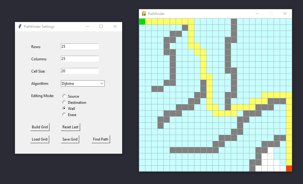 A Python pathfinding visualizer for algorithms such as Dijkstra and A*. Includes drawing, save and load features.