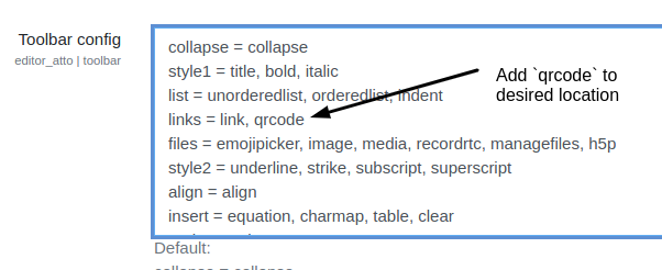 Dashboard -> Site administration -> Plugins -> Text editors -> Atto HTML editor -> QR Code