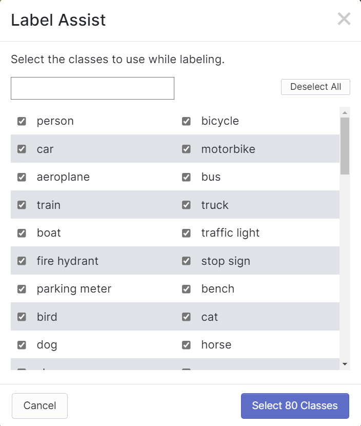 As you can see above, it can only help to predict annotations for the 80 classes mentioned. If your images do not contain the object classes from above, you cannot use the label assist feature.