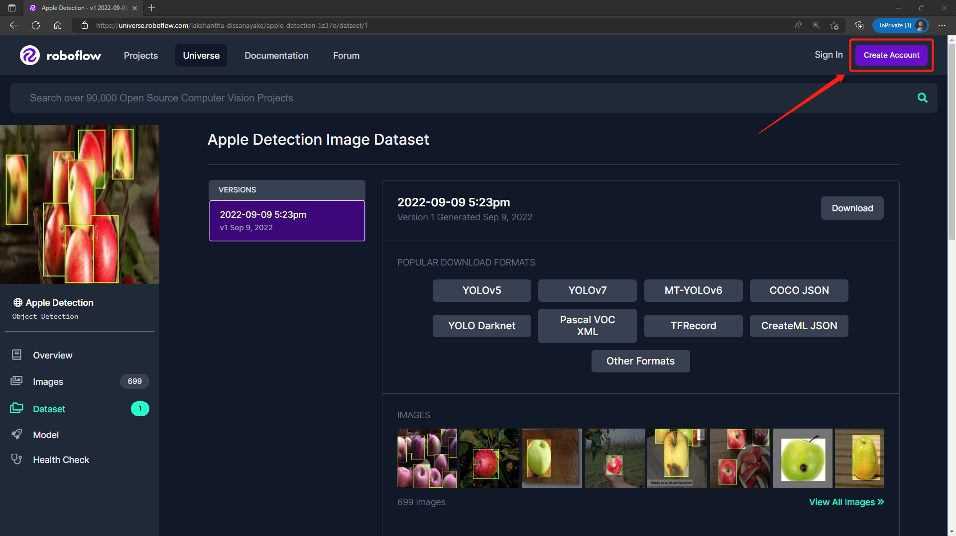 Step 1. Visit this URL to access an Apple Detection dataset available publicly on Roboflow Universe. This is a dataset with a single class named as apple