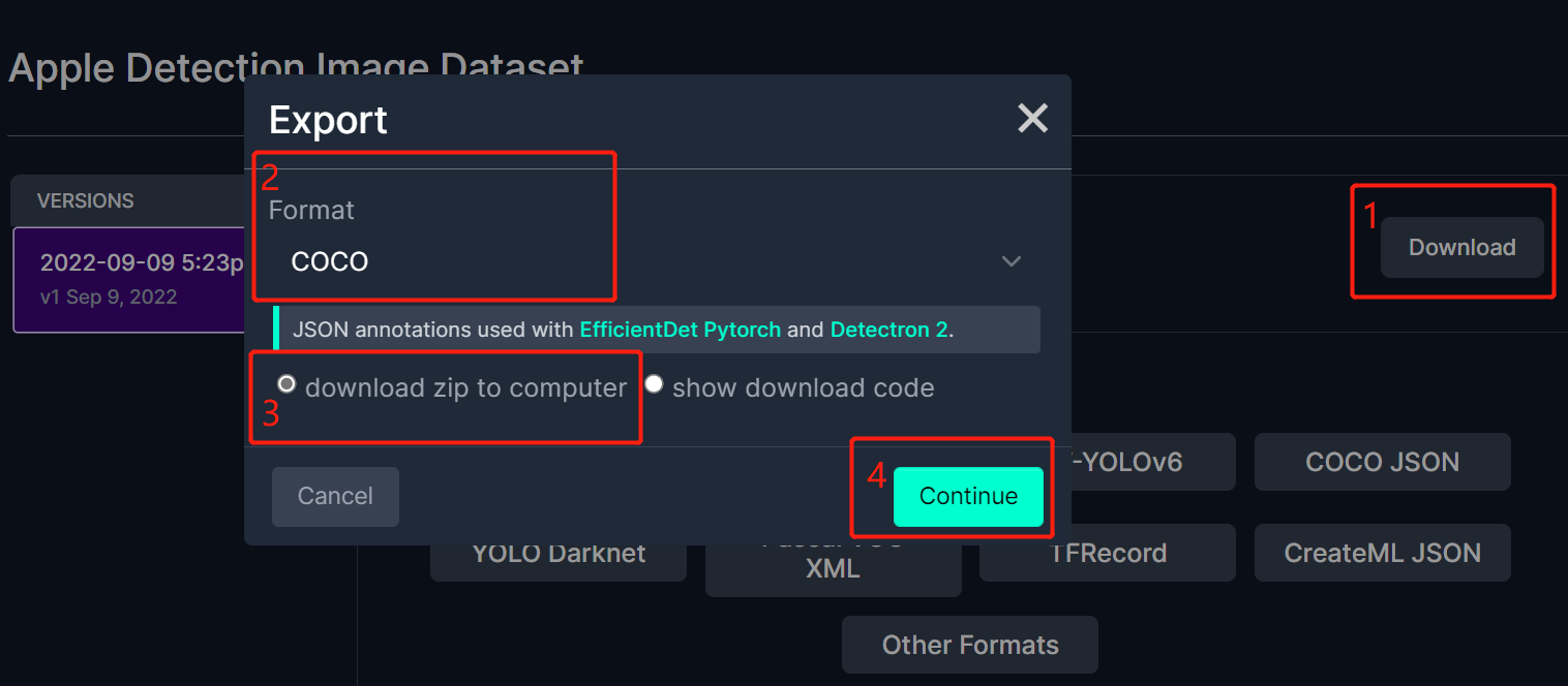 - Step 15. Click Download, select COCO as the Format, click download zip to computer and click Continue