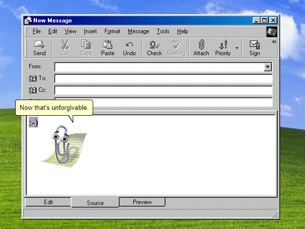 And he's here to help you (albeit passive-aggressively) with your emails – so that you can be absolutely sure your messages are as friendly as humanely possible (which is probably not that much). Go ahead and type away with your beautiful words - watch for the highlighted sections and click them, so that Clippy can help you with the rest!