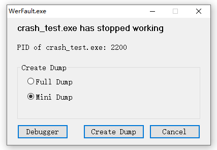 After an application crashes, first select the dump type "Full Dump" or "Mini Dump," then click "Create Dump" to generate the dump file.