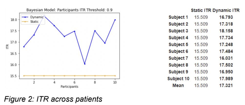 This study introduces a non-uniform dynamic stopping algorithm to decrease the overall time to make a character prediction. The intent is to use a subset of the total stimulations for each trial, with the model selecting a row and column once the threshold for both are reached. At the start of each trial, the model outputs the probabilities of each row containing the target character for one stimulation and compares the highest probability with the threshold. With the use of a Bayesian model, the probabilities are a closer representation of the true accuracies and therefore can be interpreted as the true probability that the current row or column contains the target character. If the threshold is reached, the row corresponding to the highest probability is selected and the process is repeated to select a column. If the threshold is not reached, then an additional stimulation is used to output the probabilities for each row until the threshold is reached or all row stimulations are used. Then the predicted target character is the intersection of the row and column. Note that the rows and columns may stop at different stimulations and hence is why the algorithm is non-uniform. By optimally choosing the row and column separately, the total number of stimulations required to make a character selection is minimized. For this study, a threshold of 0.9 was used.