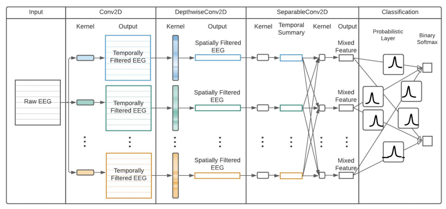 Deep neural networks will often under or overfit as it does not account for uncertainty in its predictions. With Bayesian Neural Network (BNN), however, the weights are trained as distributions instead of point-estimates, thus capturing the uncertainty of the model’s predictions. The issue with BNN is that the architecture of deep neural networks makes it redundant and costly to account for uncertainty for a large number of successive layers. Therefore, we construct a hybrid BNN architecture with deterministic layers from the EEGNet architecture proposed by [R. T. Schirrmeister, 2017] with multiple layers designed as temporal and spatial filters. This has significantly fewer parameters than other Convolutional Neural Networks (CNN). The EEGNet layers are followed by a probabilistic output layer to capture uncertainty.