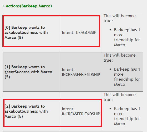 askaboutfamilyis listed twice, one associated with theINCREASEFRIENDSHIPintent with a score of 7, and the other associated withBEAGOSSIPwith a score of 4. It should instead haveaskaboutfamilylisted once, with a score of 10, with both intents listed in the intent field. There are other multiple-intent actions as well, includingaskaboutbusiness.