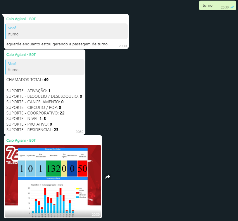 Digite: !turno e o Bot consumirá uma API própria, onde colhe recursos internos da empresa 76Telecom.