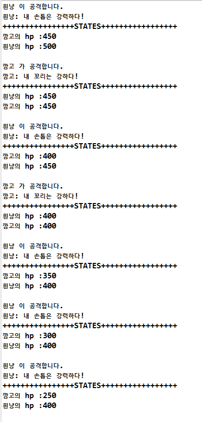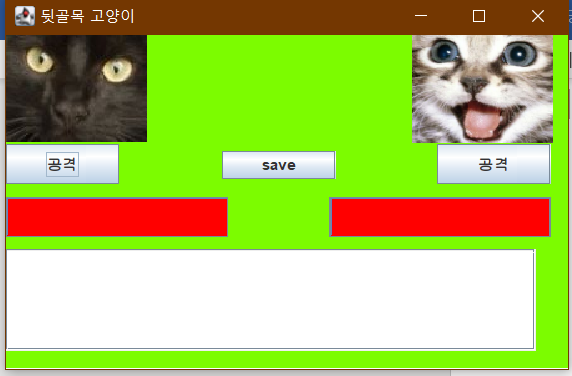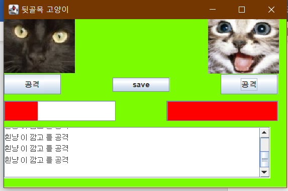 - 배틀 형식: 깜고(검은고양이)와 흰냥(하얀고양이)의 1 대 1 싸움 상황이다. 공격하기 버튼을 누르면 (액션리스너) 상대에게 데미지(50)를 입히게 된다. 공격할 때 음성으로 고양이 울음 소리가 나며 각 고양이마다 울음소리는 상이하다. 가장 먼저 hp가 0이 된 쪽이 패배하며, 한 쪽이 패배한 때에 공격하기 버튼은 더 이상 눌리지 않고, 엔딩 화면이 나타난다.