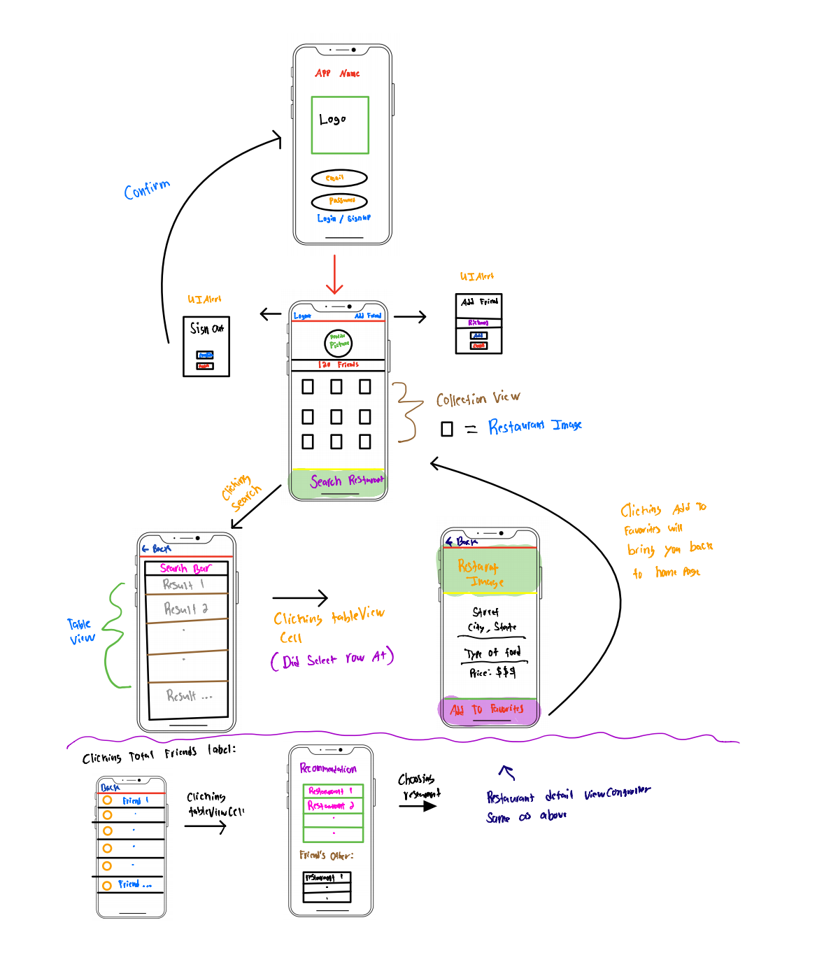 All network calls are broken down into three helper classes: FirebaseHelper, Search, & UserInformation. Just intialize class and call functions written ex: let firebase = FirebaseHelper() firebase.signInUser or .signUpUser or .addFriend or .addRestaurant ...