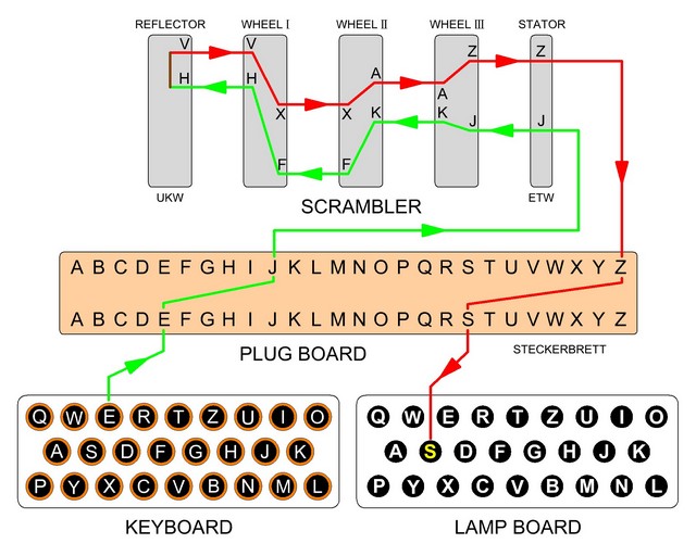 In this solution, the logical flow of the encryption of a letter is exactly the same as in a real Enigma Machine. In other words, we could say that the encryption method is exactly the same, but made through software instead of hardware. (See image in Other resources)