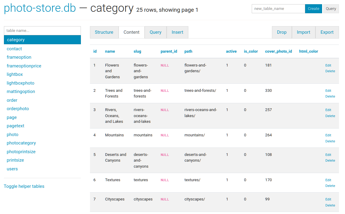 $ pip install sqlite-web$ sqlite_web /path/to/database.db- Works with your existing SQLite databases, or can be used to create new databases.
