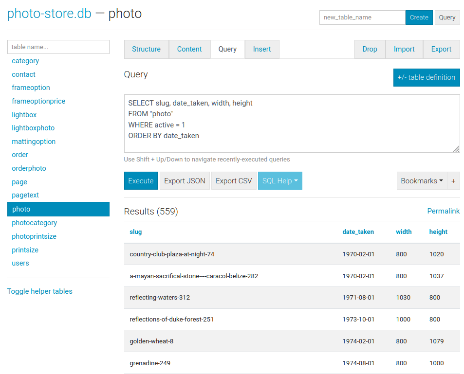 The query tab allows you to execute arbitrary SQL queries on a table. The query results are displayed in a table and can be exported to either JSON or CSV:
