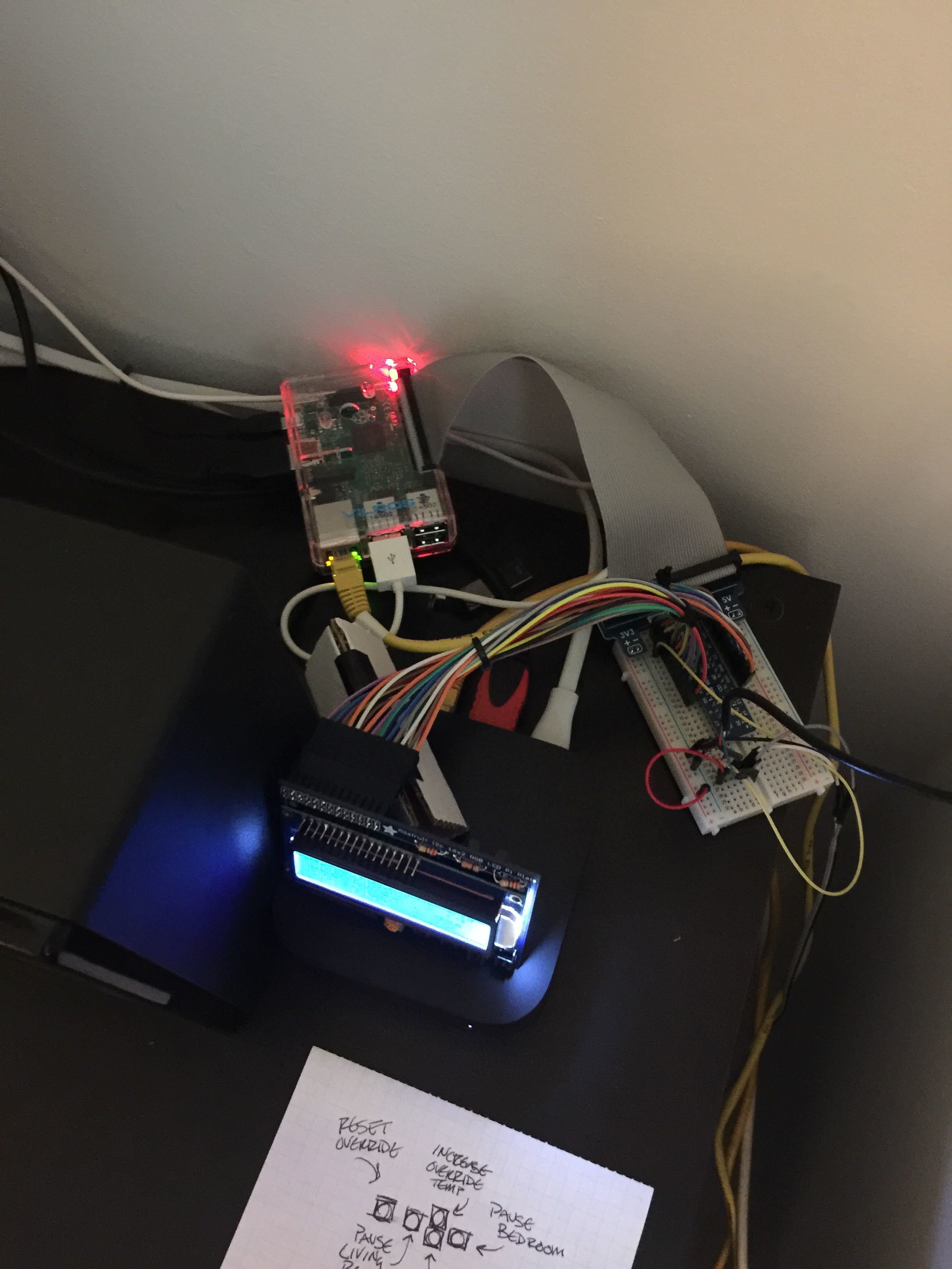 - Solution: Using a Raspberry Pi with thermometer leads on long wires, monitor the living room and bedroom temperatures. When the it gets too warm, turn on the AC units by sending messages over wifi directly to the wifi-enabled power switches that the units were connected to. Conversely, when the room is too cool, turn the AC units off to ensure they don't lock up from ice and condensation build up.