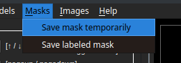 After the segmentation process, possibly including manual editing of the masks, we can save the masks in a folder with the same name as the image and place them in the same location by clicking the "Save labeled mask" button. If we want to calculate metrics for the current segmentation, we can save it as a snapshot by clicking the "Save mask temporarily" button.