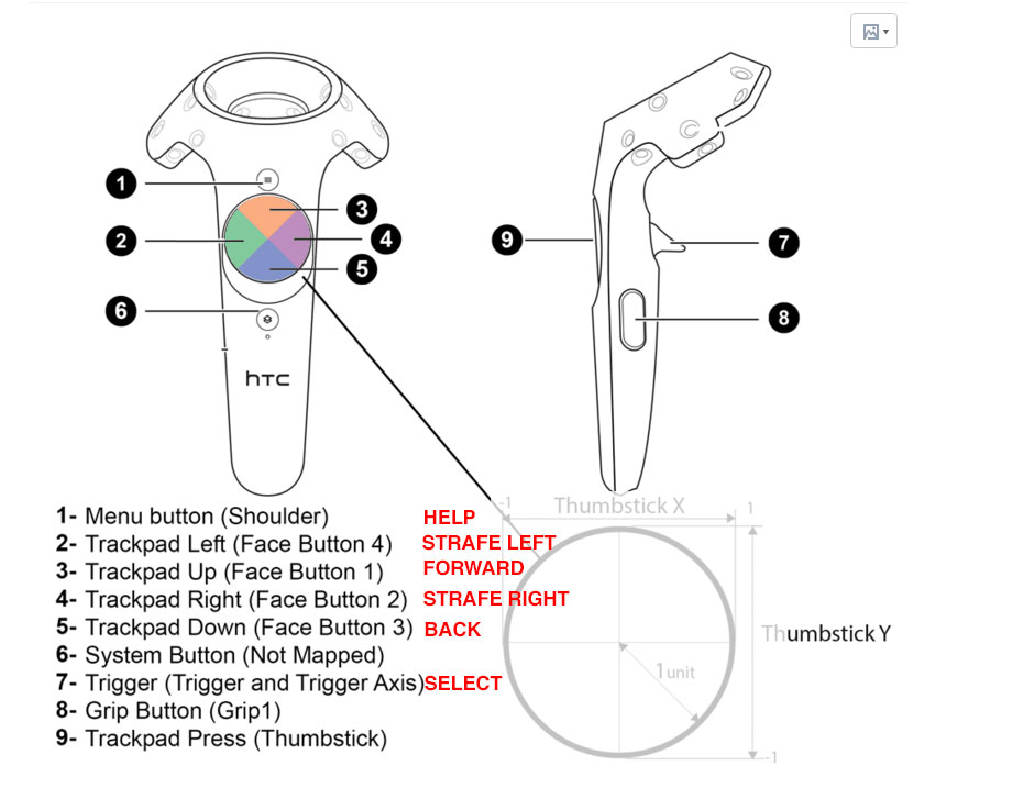 Vive gamepads should have directional controls for flying/strafing on the right hand controller, and time scrubbing controls on the left. Selection should be done with a laser-pointer style input and the trigger.
