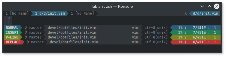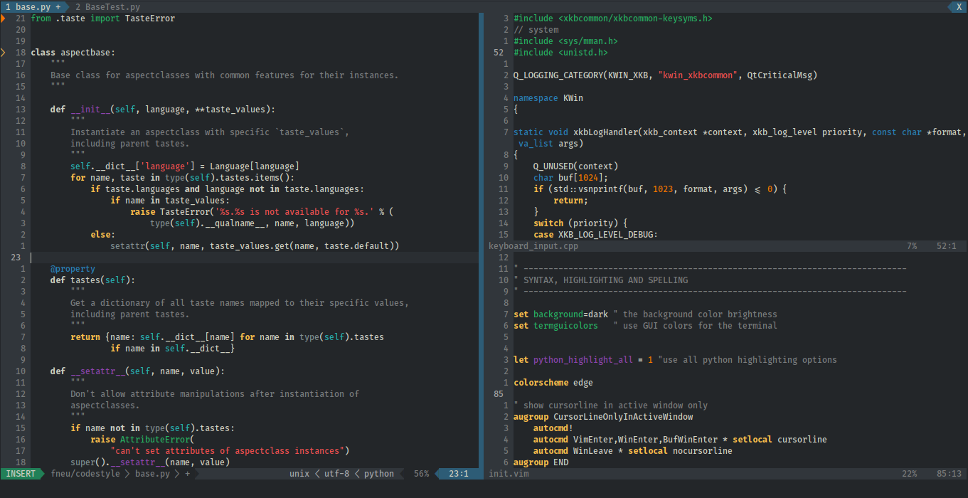 Breezy is a (neo)vim true color scheme inspired by the KDE breeze palette. It uses the colors of the "Breeze Dark" color scheme shipped with KTextEditor since KDE Frameworks 5.23.