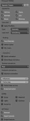 To export an actor like a priest (/models/secondtemple/priest/priest.blend) to json make sure the Blender export io_three is placed under the directory Blender\2.xx\scripts\addons. Exporting to json can be fiddly where you must first select the mesh you wish to export like selecting body below: