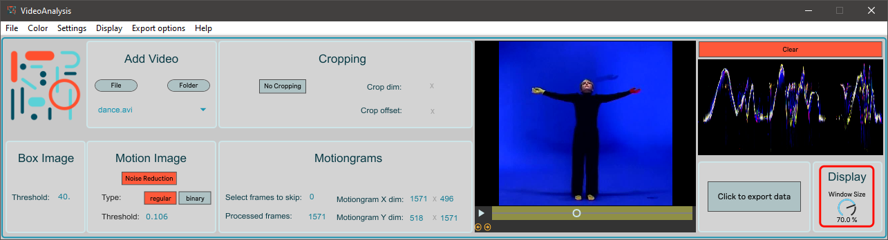 This will perform the analysis, render all the chosen images, videos, as well as perform extraction of some motion features. All the exported files will be saved to the same folder as the source video.