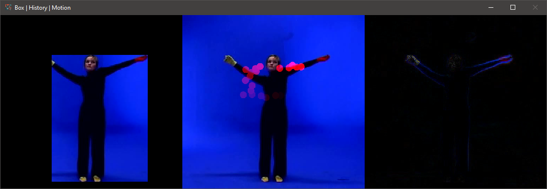 The Display window consists of the bounding box video (left), the history video (middle) and the motion video (right). You can toggle these independently from the Display menu, with the additional option to make a floating window.