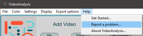 Have you experienced errors or any strange behavior from VideoAnalysis? If you take a moment and report it to us, you can greatly contribute to the development of this software. Clicking on Help > Report a problem... opens your default internet browser and takes you straight to the Issues page at our Github repository for VideoAnalysis. Here you can click on the (green) New issue button, and tell us about the problem.