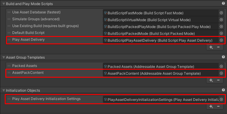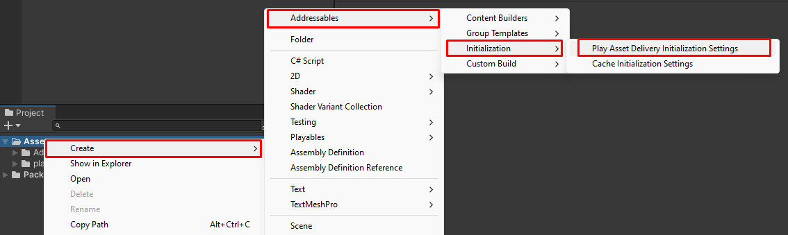 PlayAssetDeliveryInitializationSettings. Access the create menu via right click >Create>Addressables>Initialization>PlayAssetDeliveryInitializationSettings