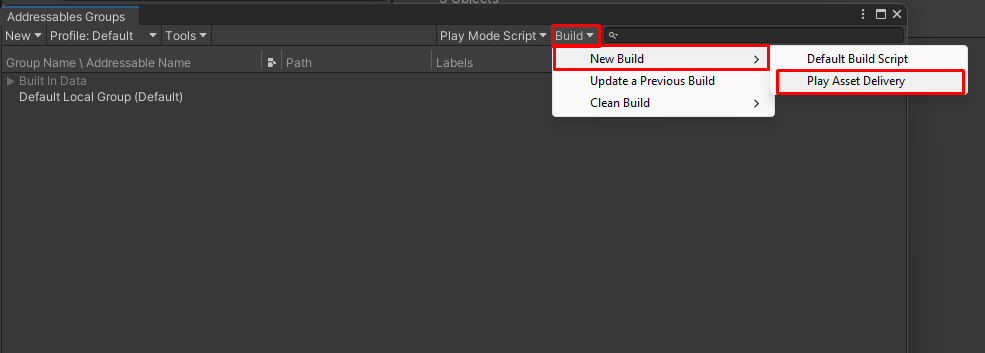 Build>New Build>Build Default Script, we now use the menuBuild>New Build>Play Asset Delivery