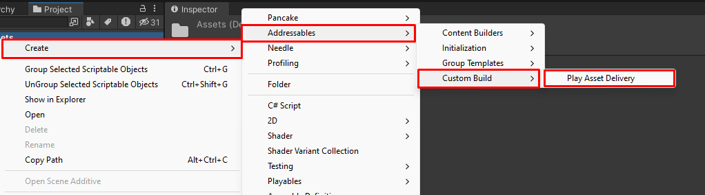 BuildScriptPlayAssetDelivery. Go to menuCreate>Addressables>Custom Build>Play Asset Delivery