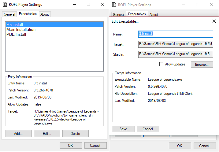 - (Optional) Add any other League of Legends installations you may have. You can name entries and set if ROFLPlayer should automatically update the entry along with the game. The default executable will be used on play button press and, if set, double click action.