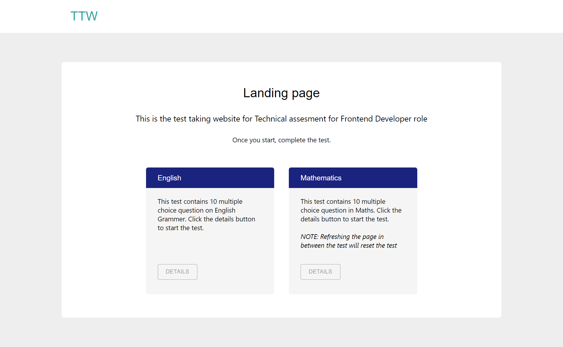 A simple landing page with Card like layout that takes the user to the test page based on selection.