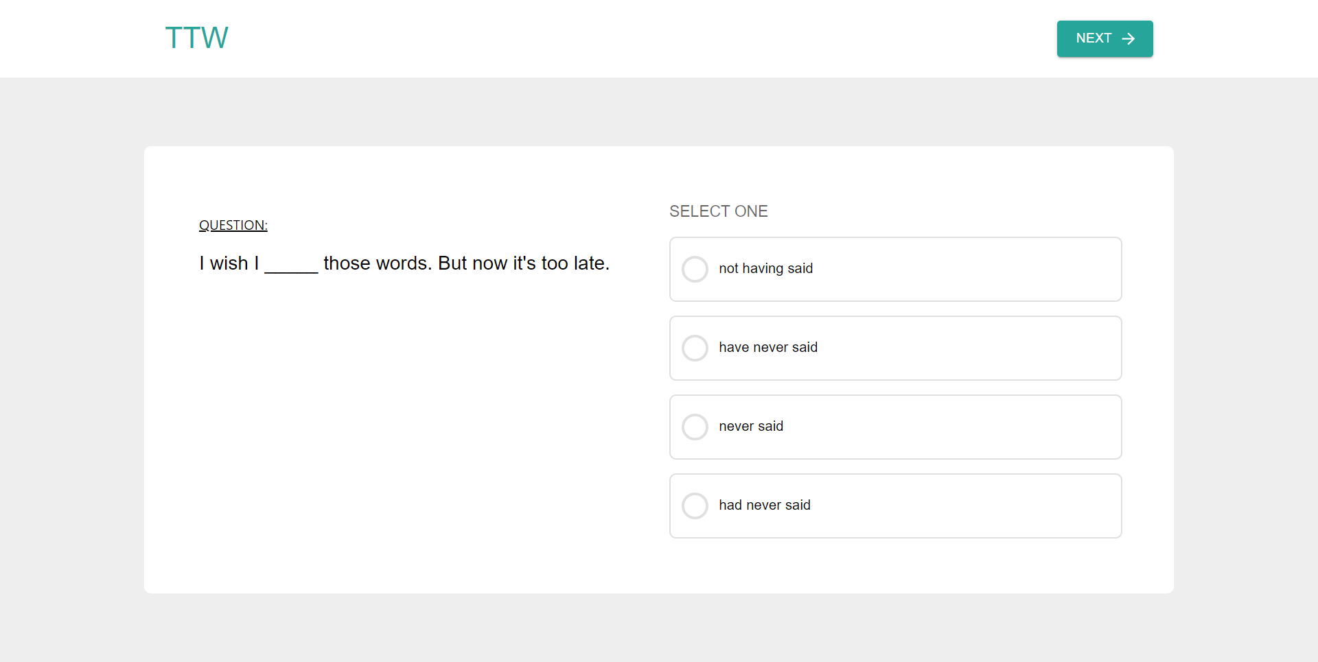 The actual test page with question and choices. There is no validation as of now, so the user can click the Next button even without making a selection. Once the user reaches the last question the button text changes to Submit