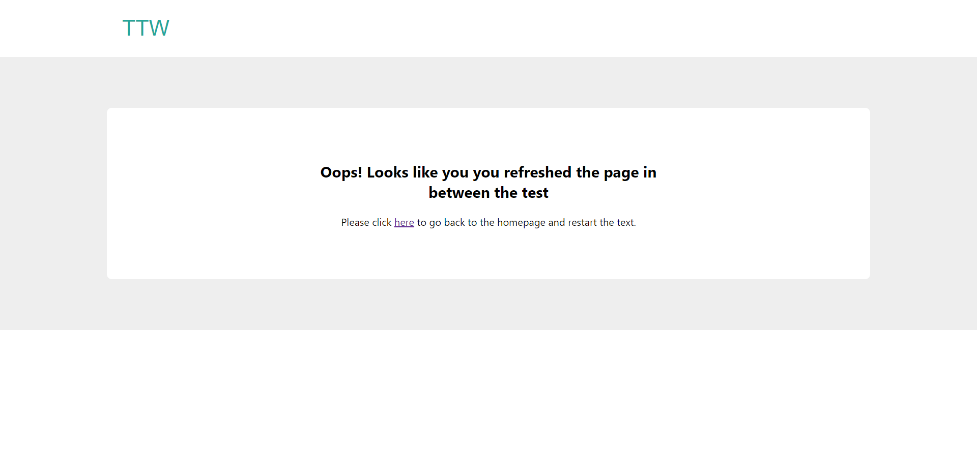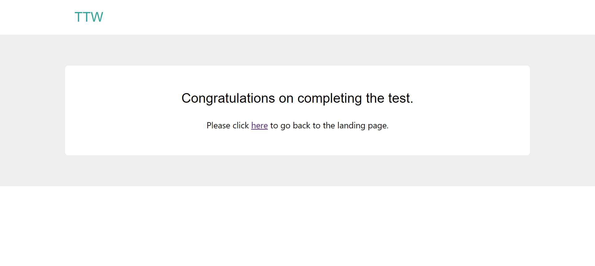 A dummy page to represent the completion of the test submission and to show the test results. Currently just plain text with a link to go to the landing page.