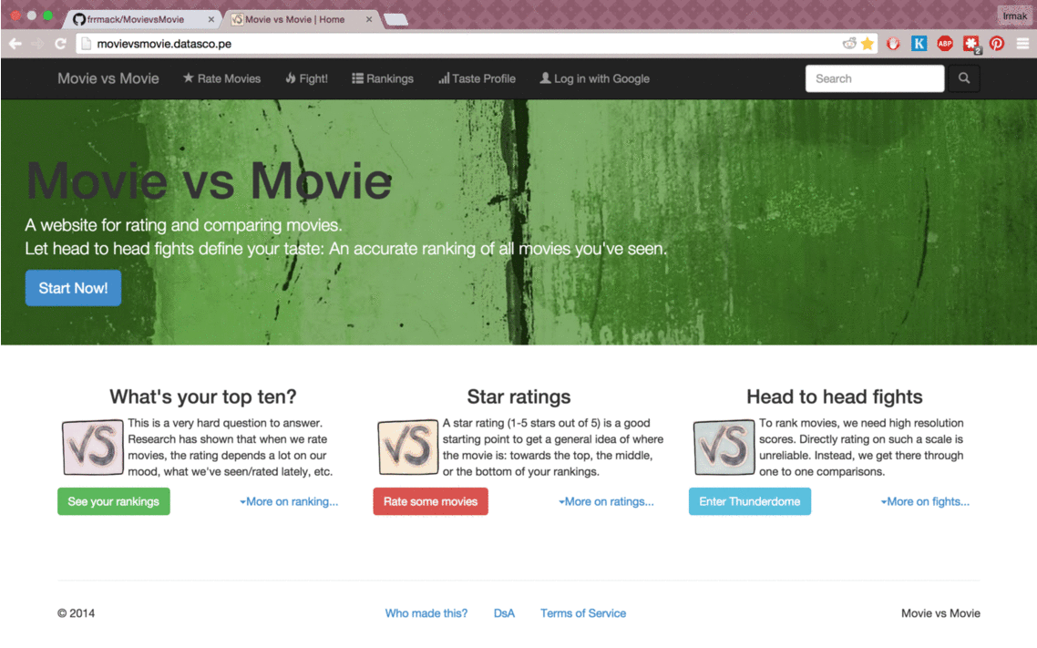 For a movie, we start by asking you to give a star rating out of five. Then, we get a better idea of how much you really like it from one on one fights against other movies.