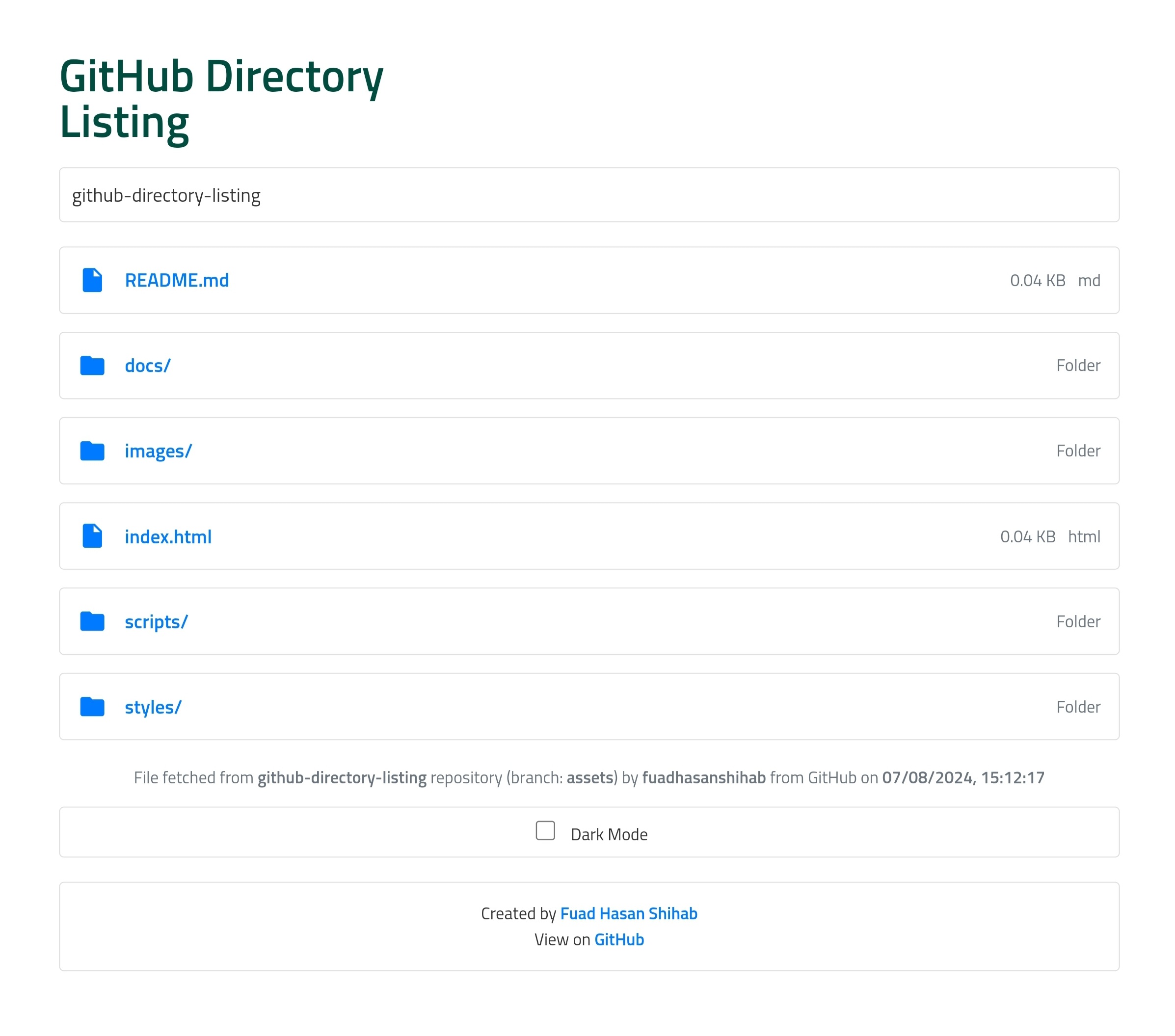 A web application for displaying GitHub repository files and directories. This project provides a clean and interactive directory listing view with features like dark mode and breadcrumb navigation.