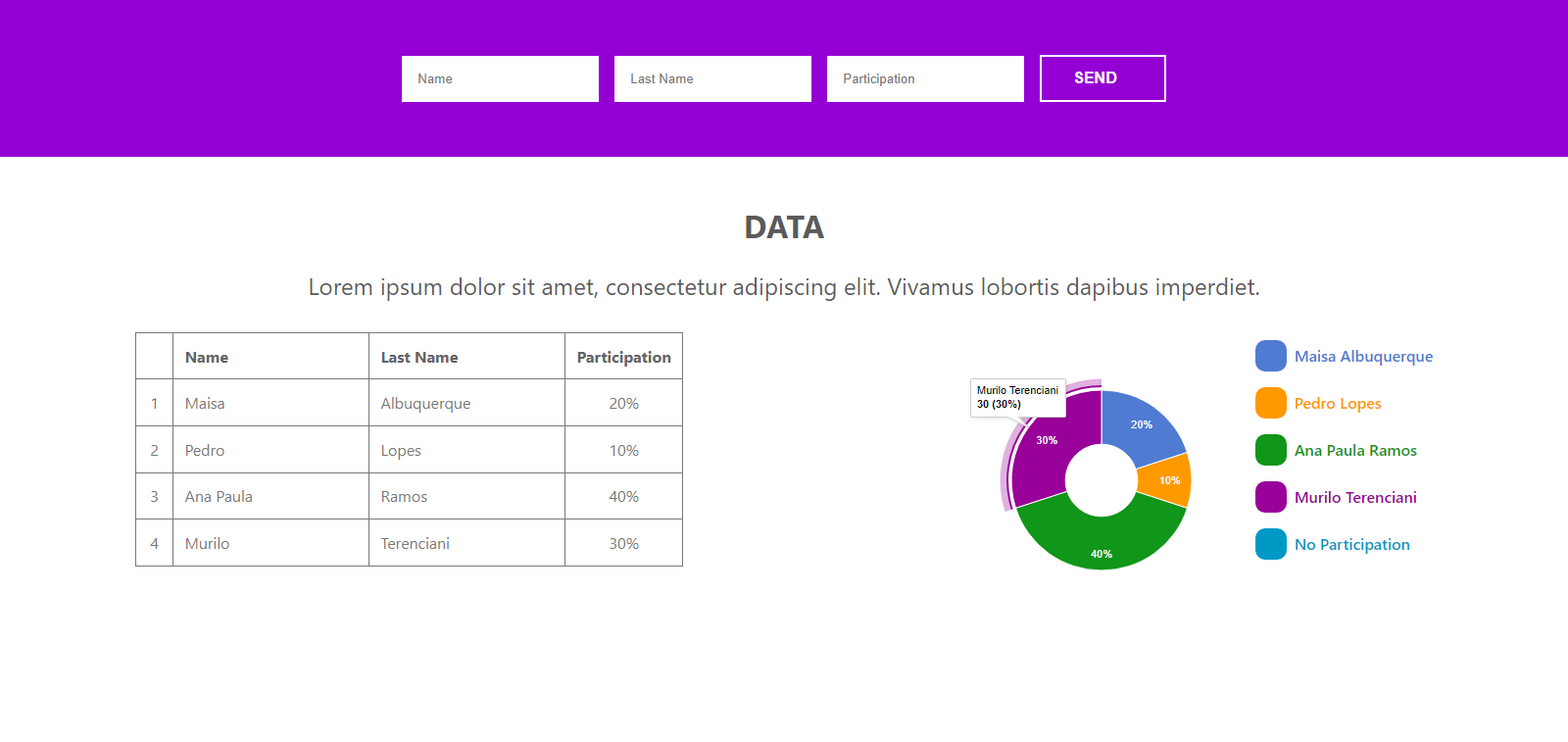 The layout has a form, a table with percentage information of participation and a pizza graph that represents this distribution.